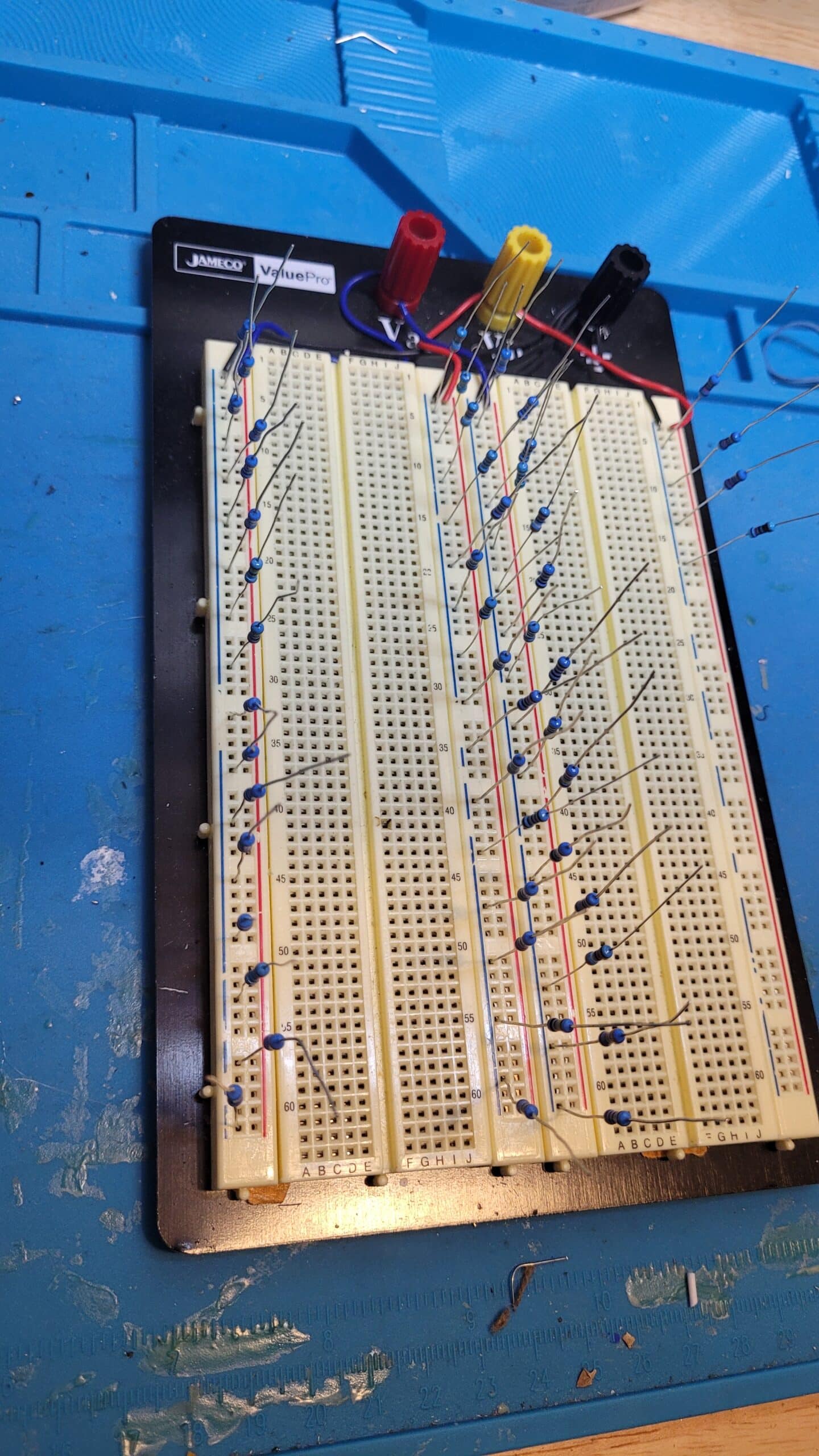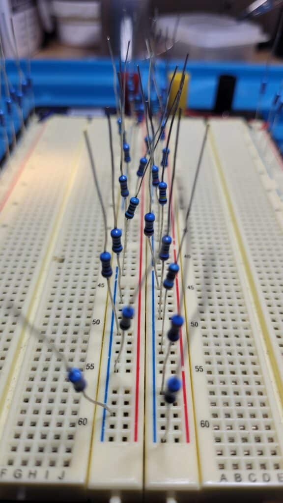 The black terminal is wired to all four sets of power rails and is used as ground. That’s the one that I use. Then I put all the resistors into that ground rail, standing straight up and down.
